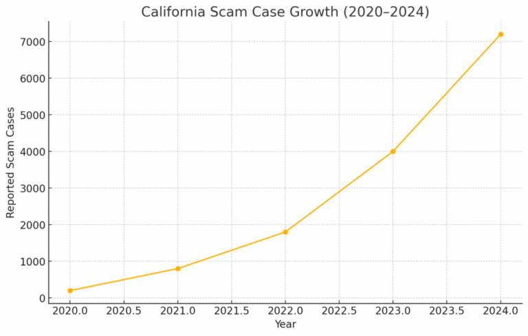 This report highlights the evolving landscape of cryptocurrency scams affecting California residents over the past five years. Reported cases jumped from around 200 in 2020 to over 7200 in 2024. However, Lionsgate Network’s internal analysis suggests that only about 1 in 16 victims formally report these incidents. Many attribute their losses to ‘bad investments’ rather than recognizing them as fraud. As a result, the true number of cases may be exponentially higher.