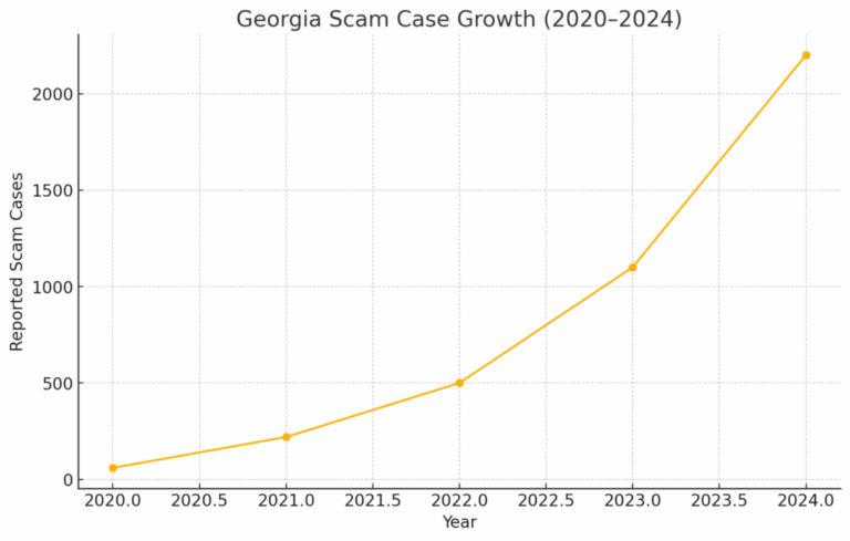 This report highlights the evolving landscape of cryptocurrency scams affecting Georgia residents over the past five years. Reported cases jumped from around 60 in 2020 to over 2200 in 2024. However, Lionsgate Network’s internal analysis suggests that only about 1 in 16 victims formally report these incidents. Many attribute their losses to ‘bad investments’ rather than recognizing them as fraud. As a result, the true number of cases may be exponentially higher.