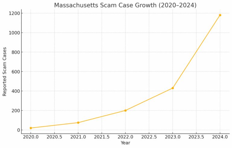 This report highlights the evolving landscape of cryptocurrency scams affecting Massachusetts residents over the past five years. Reported cases jumped from around 20 in 2020 to over 1180 in 2024. However, Lionsgate Network’s internal analysis suggests that only about 1 in 16 victims formally report these incidents. Many attribute their losses to ‘bad investments’ rather than recognizing them as fraud. As a result, the true number of cases may be exponentially higher.