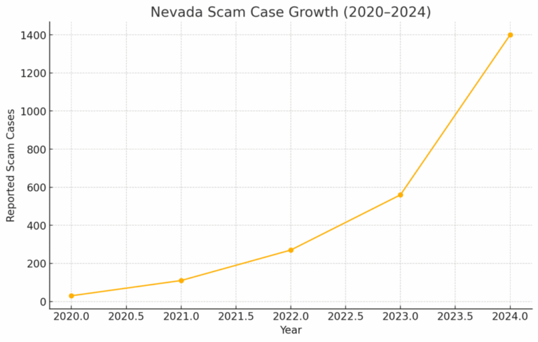 This report highlights the evolving landscape of cryptocurrency scams affecting Nevada residents over the past five years. Reported cases jumped from around 30 in 2020 to over 1400 in 2024. However, Lionsgate Network’s internal analysis suggests that only about 1 in 16 victims formally report these incidents. Many attribute their losses to ‘bad investments’ rather than recognizing them as fraud. As a result, the true number of cases may be exponentially higher.