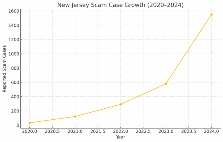 This report highlights the evolving landscape of cryptocurrency scams affecting New Jersey residents over the past five years. Reported cases jumped from around 32 in 2020 to over 1550 in 2024. However, Lionsgate Network’s internal analysis suggests that only about 1 in 16 victims formally report these incidents. Many attribute their losses to ‘bad investments’ rather than recognizing them as fraud. As a result, the true number of cases may be exponentially higher.