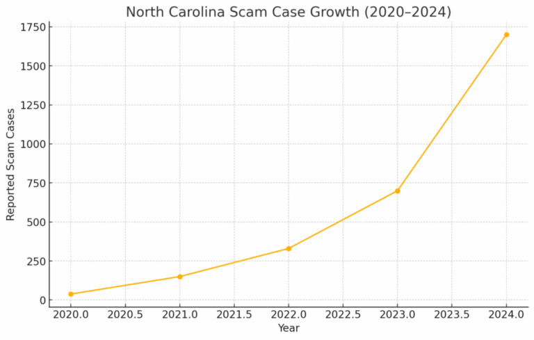 This report highlights the evolving landscape of cryptocurrency scams affecting North Carolina residents over the past five years. Reported cases jumped from around 38 in 2020 to over 1700 in 2024. However, Lionsgate Network’s internal analysis suggests that only about 1 in 16 victims formally report these incidents. Many attribute their losses to ‘bad investments’ rather than recognizing them as fraud. As a result, the true number of cases may be exponentially higher.
