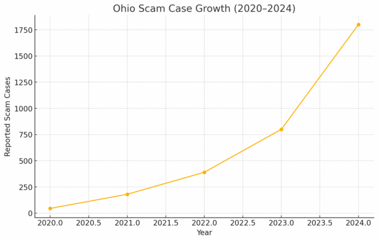 This report highlights the evolving landscape of cryptocurrency scams affecting Ohio residents over the past five years. Reported cases jumped from around 45 in 2020 to over 1800 in 2024. However, Lionsgate Network’s internal analysis suggests that only about 1 in 16 victims formally report these incidents. Many attribute their losses to ‘bad investments’ rather than recognizing them as fraud. As a result, the true number of cases may be exponentially higher.