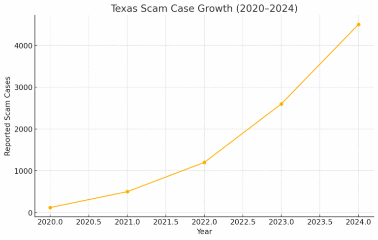 This report highlights the evolving landscape of cryptocurrency scams affecting Texas residents over the past five years. Reported cases jumped from around 120 in 2020 to over 4500 in 2024. However, Lionsgate Network’s internal analysis suggests that only about 1 in 16 victims formally report these incidents. Many attribute their losses to ‘bad investments’ rather than recognizing them as fraud. As a result, the true number of cases may be exponentially higher.
